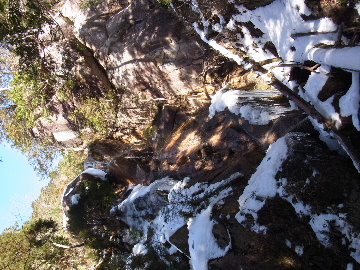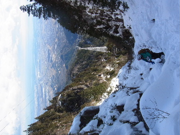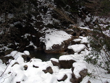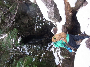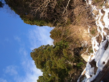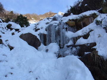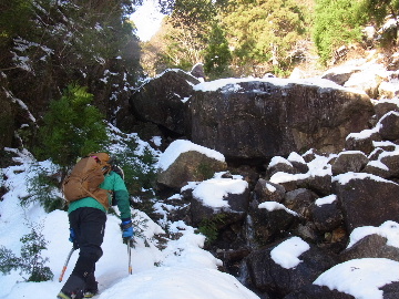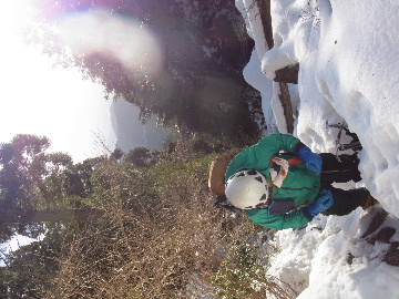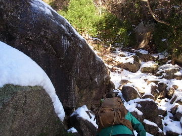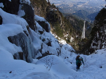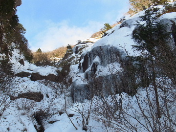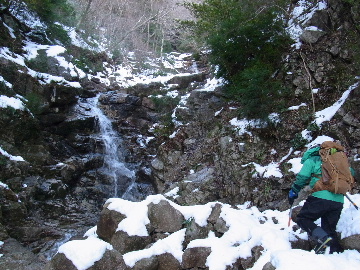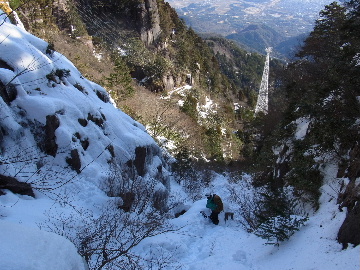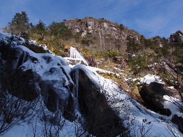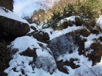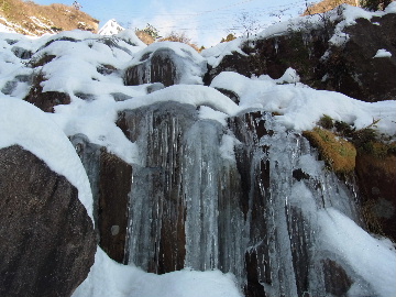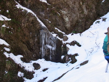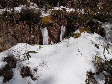 年が明けたと思ったらもう11日。お正月は孫守りやらなんだかんだでお山もサボタージュ。若い頃のように「行きたい!」って気が起こらないんですね。これも年の所為? 松の内も明け、氏神様やお伊勢さんのお札もどんど焼きに出したし、いい加減登り初めもしておかなくては。 身体の老化は精神の老化から。これ以上身体を萎えさせない為にも、老体に鞭打って登り初めに出かけますか。と言う訳で今年は遅い登り初めです。 6:50 a.m. 割谷駐車場着。 年末に来た時と比べ雪が少ないです。駐車場に結構積もっていたのですがすっかり融けてしまったのか、それとも除雪してくれたのか? いやスカイラインにも雪は殆ど無いですから融けてしまったのでしょう。こりゃお山の雪も期待薄? Iお父さんに年始のご挨拶。そして仕度にかかります。毎度毎度お待たせして申し訳ございません。 今日は風が強そうです。じゃあ谷間で風の影響の少ない本谷にしますか。雪は期待薄ですが。 7:10 a.m. でっぱつ。 雪が少なく地面が見えています。年末より少ないですからやはり融けてしまったようです。残念、年末の雪は根雪にならなかったか? 沢に出てからも昨日土曜日のものらしいトレースが付いています。有難く使わせて頂きますが、このルート取りって年末のものを踏襲しているのでは? しっかり穿り返された泥んこ道を辿ります。あ〜、ヤダヤダ靴が汚れる。 Iお父さんはストックをツルハシに替えます。えっ、ダブルアックス? お母さん居ないのにお母さんの分も持って来てたんじゃ軽量化出来ないじゃん。あの荷重に耐えられる体力が羨ましいです。 7:35 a.m. 不動滝着。 一瞬東の空が晴れ朝日が射しましたが直ぐにまた曇り。それでも空は明るいので年末程冷え込む事はなさそうです。 前回は夏用のシャツを着ていたのですっかり冷えてそれが消耗に繋がったのだと思います。それで今日は薄手のカシミヤセーターを肌着として着込んできました。若い頃はウールの肌着が一般的でしたが今はもう扱っていないようです。新素材か何か知りませんがどんな化繊よりデッドエアーが90数%もあるウールかカシミアの方が絶対に暖かいに決まっています。濡れても暖かいウールかカシミア、山にはこれ一択です。・・・時代遅れのジジイの戯言かもしれませんが。 お喋りしながら登っている内にもう大岩の下。あちこちのツララが綺麗ですね〜。 気が付けば日が当たり出しあちこちが光り輝いています。日向に出ればポッカポカ、お日様の力、恐るべし。 8:15 a.m. 大岩の少し上で休憩。 この時期大岩は日が当たりません。折角のお日様、身体中に受けての休憩です。う〜ん、冷たいお茶が旨い。 雪は前回より少なめですが適度に締まっており歩き易いです。そのお陰か天気が好いおかげか今日は頗る快調! 気が付けば右岸バンドも過ぎ大黒滝。 8:35 a.m. 大黒滝着。 まだ大分気温が高いようでショボい氷。あれだけ飛沫を上げて水が流れてたんじゃ全面氷結はまだ期待薄。 巻道を伝い潜り岩に向かいます。 9:05 a.m. 潜り岩上で小休止。 かなりの速度で雲が流されて行きます。その度に晴れたり曇ったり。あの雲脚、山頂はかなりの強風が予想されます。 雑談しながら、今日も又アイゼン無しでここまで来てしまった事に気付きます。この適度な雪の締まり具合、この先もうアイゼンが要る所はありません。 また今日も筆下ろしが出来んやった。折角重い思いをして担いで来たのに。あ〜いつになったら筆下ろしできるんやろ。一生DTのまんまだったりして。こんなことなら大枚五千円も出してMade in R.O.C のアイゼン、買わなくても良かったんじゃあ? まだシャルレの10本歯使えるんだし。 常日頃節約に励んでいる年金生活者のtanuoさんは思い悩む事ばかり。老いたtanuoの悩み?(若きウェルテルの悩み?)ゲーテとちゃうちゃう。 この先積雪はまだ少ないですが、雪は適度に締まっています。ビブラムが雪によく食い込み快適なルンゼ歩き。ツルハシのシュピッツェが浅い雪の下の岩に当たり鈍い金属音を立てながら行きます。なんか懐かしいようなシチュエーション。 ワワッ、ウメバチ地帯の岩に大きなベルグラ。ついかき落として登りたくなるようなテンプテーション。 その先も氷の世界が続きます。 モウセンゴケ地帯の側壁にもベッタリと大きなツララ。 気が付けばもうドンツキ。 9:45 a.m. 大黒岩展望台着。 背もたれ岩が山頂からの強風を遮り、麗らかな春山気分。お日様ポカポカ日溜まりハイク。ええもんですなあ。やっぱり来て良かった。 一ノ谷新道と合流し暫く行くと急に空がかき曇り雪がちらつきだします。山の天気の移り変わりの速さよ! そして山頂広場に出た途端、雪面がツルツルでスッテンコロリ。ああ、やっぱりアイゼン着けとくべきでしたわ。 なんとか騙し騙し自然学校へ。 10:20 a.m. 自然学校着。 トイレから出るとまたお日様が顔を出しています。自然学校の建屋や風除けになりポッカポカ。 そして望湖台に向かうとまた曇り。