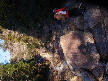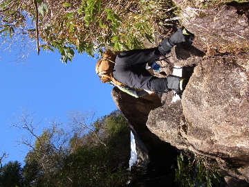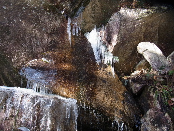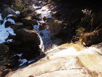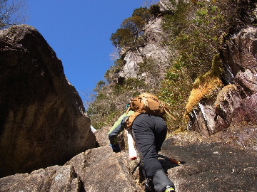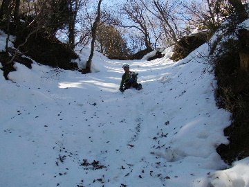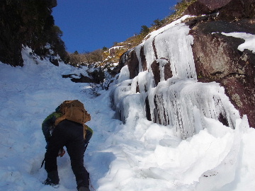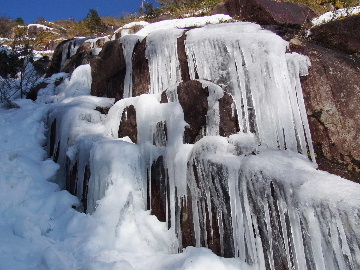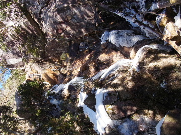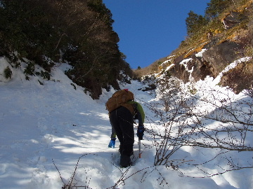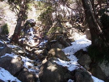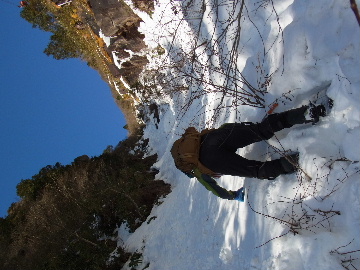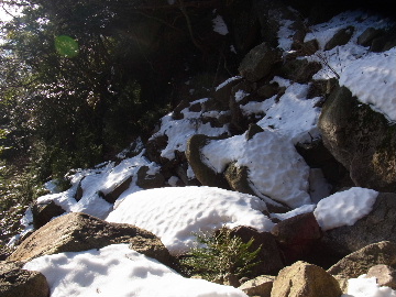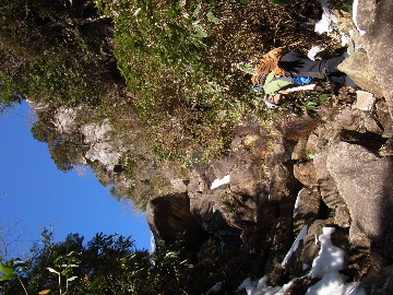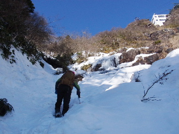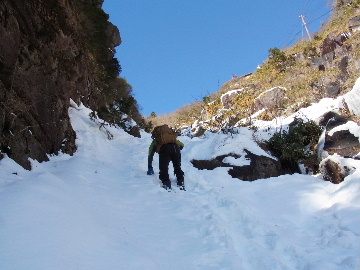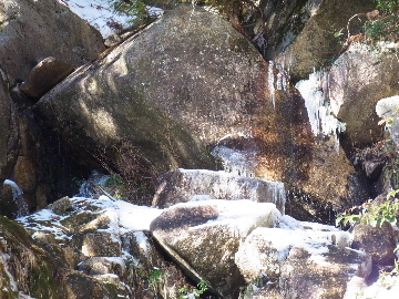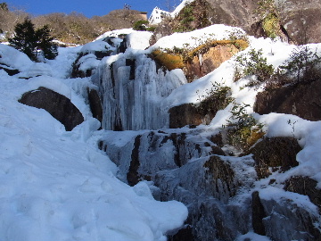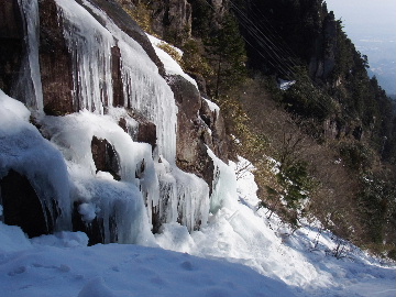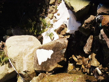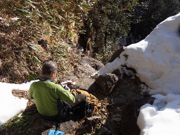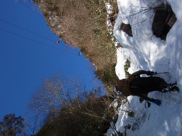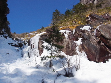 今週末は好天とか。じゃあもう一発行っとく? てな訳で今週はホームゲレンデ。 先週の三ツ口谷の様子ならこちらも雪はまだありそう。 6:30 a.m. 割谷駐車場着。 Iお父さんはもう到着済み。近くの車の人とお話をしていたようです。誰彼分け隔てなく人懐っこく話しかけられるあの性格、ホント羨ましいです。 早速仕度にかかります。多少冷えてはいますが外で靴を履きます。リアゲートを開け、そこにおケツを乗っけて。それくらい温かくなったって事ですね。 今日は好天、本谷上部は雪の中。直射日光と雪面の照り返しの両面グリルでこんがりと焼ける事でしょう。「今日は熱くなるぞう。」 レボーグのトランクに入れっぱなしのアイゼンも一応ザックに入れておきます。買ってからまだ一度も履いていません。毎回、「今日こそ筆下ろしするぞ。」なんて思いながらザックに放り込むのですが、いつも忘れてしまいます。なら入れなきゃ良いじゃん。 netの購買履歴を見ると2023年10月発注となっています。てことは買ってから3シーズン履いてないって事か。買わなくても良かったのでは? 半世紀前のシャルレの10本歯はまだ使えるんだし・・・。 6:45 a.m. でっぱつ。 スカイラインを歩き始めると一部凍った所も。水が流れている所は良いのですが流れていない所は凍っています。温かくなったとは言えやはり氷点下にはなっているんですね。しまった、ここで試し履きすれば良かったかな? いえいえアスファルトが傷みます。良い子はそんな非常識な事をやってはいけません。 疎林帯を辿ります。雪は欠片もありません。 沢に出た所でベストを脱ぎます。風もなく穏やかな天気、見上げる空は雲一つないピー缶の青。 ずっと雨が降って無いのに沢の水が多いです。宇連ダムがカラッケツで豊川用水が制限がかかるとかかからないとか。関東の那賀川もカラカラで水道水が藻で臭いって話もありました。本谷の水あげましょか?って私のものでは無く三重県の方のものでしたね。 でもこれは融雪が進んでいるだけの話。いずれ本谷の水も半涸れでしょう。 雪の無い水際を行きます。夏場と同じコース取り。 まだ薄暗い谷の中、日が当たっている所だけ強烈なスポットライトに照らされているよう。 不動滝の巻道、途中で一息入れます。「昔は一気に行けたのに。」とIお父さんの言。まあお互いそれだけ年をとったって事ですね。でも80才を過ぎてこれだけ動けるなんて常人ではありませんよ。後5年後の私がそこまで動けるとも思えませんし。 まあ無理せず年に合ったペースで山歩きを楽しみましょう。 谷に降りた所でもう一息入れます。柔らかな日を浴びながらのんびりします。年相応、ええもんですな。 大岩の上に上がると冬場は日陰だったのに日向がグンと広がっています。そうか後一月でお彼岸ですからね。 その少し上まで行き小休止。冷たいお茶が旨いです。 小滝連続帯の上部まで来るとほんの少し氷が着いています。 右岸バンドもも雪無しで乾いておりビブラムのままでスイスイ。 少し登って大黒滝を見ると、アチャー、水がジャージャーで凍っていません。流れから離れた滝横に少し氷が着いているだけ。今年は氷結しなかったのかな? 滝下まで行ってもう一枚。 この辺りから締まった雪が階段状になっており階段上り。ステップ切ってくれた足跡の主さん、有難う。 縦樋滝には雪の残骸も無くカラカラ。今年も登れんやったなあ。と言う事で巻道へ。 巻道途中にはツララの面白い造形。風で出来たものですね。根性が捻じくりまわったツララです。 恐い巻道から谷に戻るとまた雪無しの沢。夏同様に登ります。 左岸クラック登攀中のお父さんに密着。ケツばっかり写してごめんね。 8:35 a.m. 潜り岩の上で小休止。 一汗かいた後は燃料補給します。血圧が高いというIお父さん、バナナを食べています。バナナに多く含まれるカリウムは食塩(ナトリウム)を体外に排出してくれるから身体に良いんですよ〜。 さて、ここから上は雪の詰まったルンゼ歩き。攀じらなければならない岩も今は雪の下。ステップが階段状に着きその階段を歩くだけ。 あれ〜、今日もアイゼンの筆下ろし出来んやった。この先凍る事も無さそうだし、筆おろしは来シーズンかな? 延々と続く雪の回廊をひたすら上ります。左岸の岩に着いた氷が綺麗です。剥がれ落ちた氷がその下に反り立っています。今張付いている氷も白く濁っており融け落ちるのは意外に早いかもしれません。 次々と現れる氷を愛でながら行きます。 そしていよいよドンツキ。 9:15 a.m. 大黒岩展望台着。 特等席に二人並んで陣取ります。う〜ん、コンビニの調理パンが美味い。Iお父さんから頂いた竹輪が美味い。冷えたワインが頂きたくなりますねえ。 昔ようやったなあ、ワイングラスまで担ぎ上げて、終了点が一般道の所でハイカー諸氏を前にこれ見よがしにワインを開けて〜、ポンッ。 お日様燦々、風も無し。惜しむらくは春霞で遠望が全く効かない事。御嶽も中