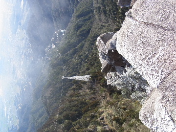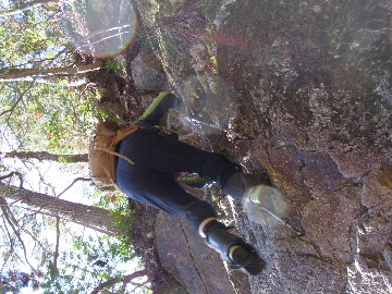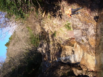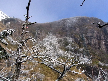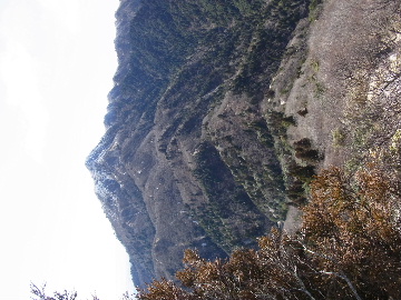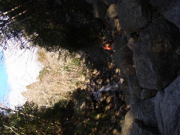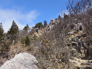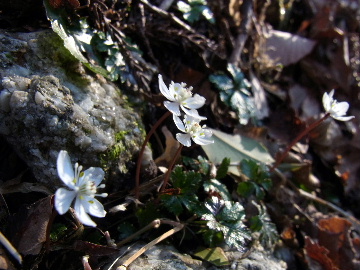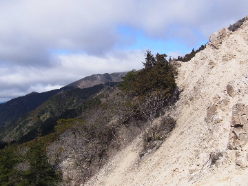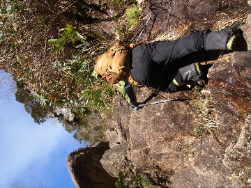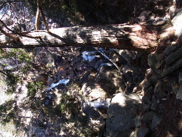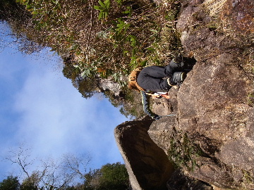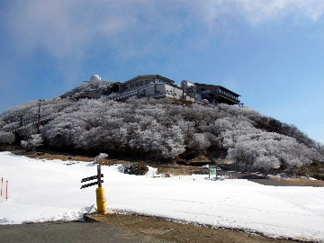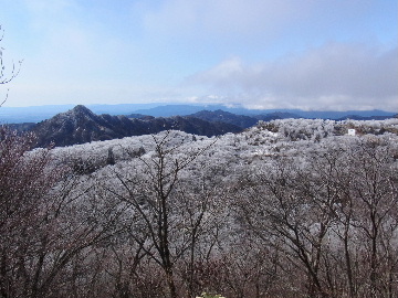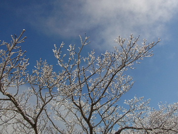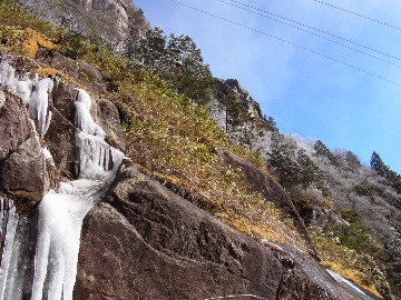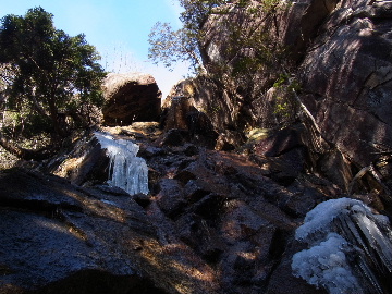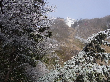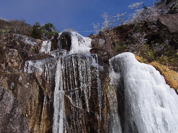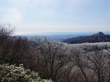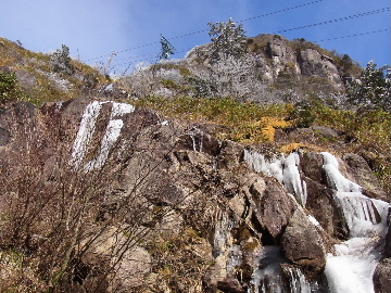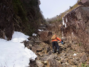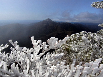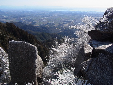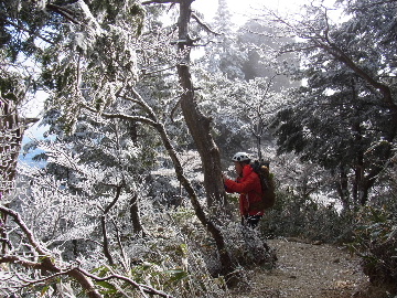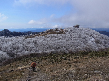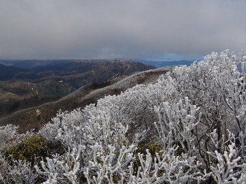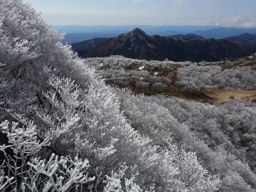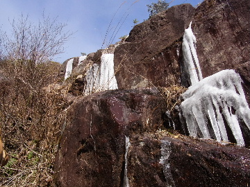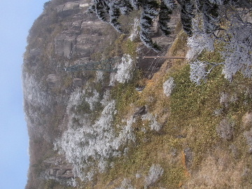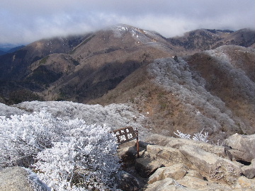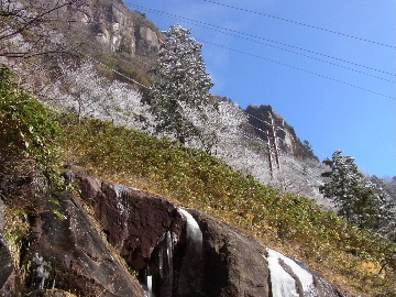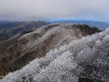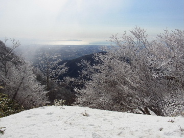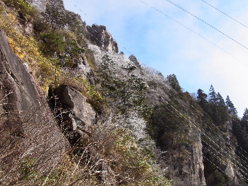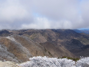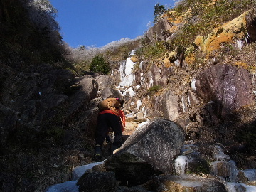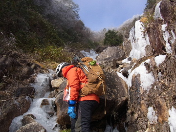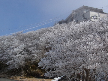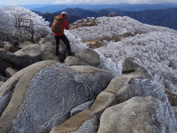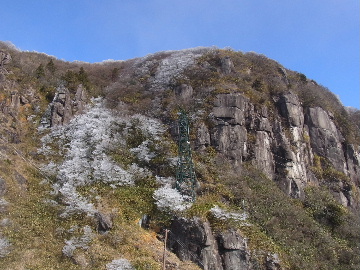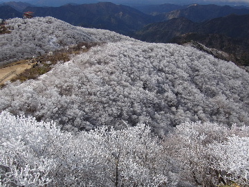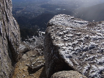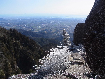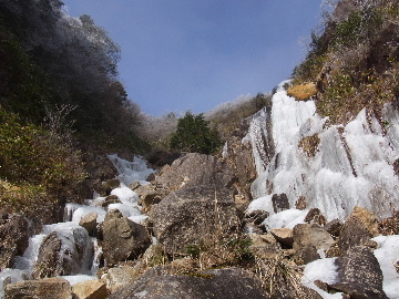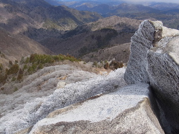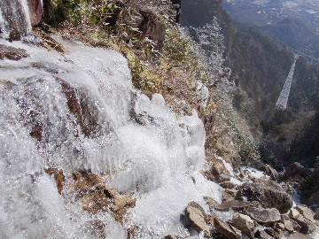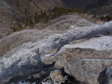 孫太尾根の予定が急遽変更。一週延ばして本日はまたホームゲレンデ。 もう直ぐお彼岸、春らしくなってきました。日の出も早けりゃ気温も高め。 6:15 a.m. 割谷駐車場着。 朝から良い天気なのに車が少ないです。日曜だというのに常連さん達も今日はお休みのようです。 Iお父さんの隣に停め仕度にかかります。リアゲートを開けリアバンパーに腰掛け靴を履きます。 温かい筈が強風に煽られ「寒っ!」それでもベストは着込まずにジャケットだけ羽織り出発です。 当然冬道具は全て置いて行きます。「荷物軽っ!」 6:25 a.m. でっぱつ。 今日も山頂付近には霧氷が付いています。ガスは先週程無いので霧氷も大して無いでしょう。 朝日を浴びながら谷を遡行して行きます。谷の中は風も無く朝日の暖かみを感じながら行きます。ホント好い季節になりました。これからは花も次々に咲くでしょう。 滝横を這い上がりバイカオウレン自生地。先週は日射しが無かった所為で開花は少なかったですが、今日はいっぱい咲いています。やはりお花もお日様次第。 薄暗い谷中から見上げる空はまっ晴れ。日向に出るとポカポカ温かいです。 7:10 a.m. 不動滝着。 巻道を過ぎ大岩手前にツララが落ちています。谷の側壁から染み出した水がツララとなっています。夜は結構冷えているようです。 大岩の登りもすっかり乾いておりフリクションを効かせて行きます。 7:25 a.m. 大岩上で小休止。 すっかり日が当たるようになり日向ぼっこしながら休憩です。さすがにお尻は冷たいです。全くの無風ですがじっとしているとおケツから冷えて来ます。ボチボチでっぱつ。 樹林帯の巻道から小滝連続帯の上へ。 そして右岸バンド。雪も無くホールド、スタンス共に選り取り見取り。 ここを越えると右前方に大黒滝。先週は完全に無くなっていた氷が滝の横に少し出来ています。ショボいですが儲かったような気分。 手前まで行ってパチリ、真下まで行ってパチリ。 縦樋滝を巻いて〜、先週氷が着いて恐かった所も今日はカンラカラに乾いており問題なしでスーイスイ。 谷に戻り潜り岩左岸クラック。Iお父さんの雄姿をどうぞ。っておケツばっかり撮ってゴメン。 8:00 a.m. 潜り岩上で休憩。 日向に二人並んで行動食。輝く伊勢湾にセントレア、その奥に三河湾。渥美半島には田原の蔵王山のシルエット。そして背後には中道フランケが覆い被さるように聳えています。 乾いたルンゼを行きます。右側の日陰に所々雪渓が残っている程度。スパッツも置いて来ましたが必要なし。 遠望は結構利いていますが上空には薄雲があるようで遠くの山ははっきりしません。 北西風が強いようで前方上空は白い雲に閉ざされたり青空が覗いたり。風花か霰か氷の粒が降って来ます。よく見ると霧氷の欠片です。強風に煽られ剥がれ落ちているのでしょう。 案の定屏風岩の下の樹林が霧氷で白くなっています。いや高度を上げるに従いそれがどんどん広がって行きます。下からは見えなかったのですが、かなりの範囲に霧氷が付着しています。 そして行く手には新たな氷柱が。先週は殆ど融けていましたから、この一週で出来たものでしょう。 足元は? 先週は水が流れていたのに今日は氷の回廊。氷から覗いている石を拾いながら登って行きます。おもしれーんだな、これが。 ドンツキから尾根に這い上がると、うわっ、何これ? 周りの霧氷が輝いています。光の世界、氷の世界。 大黒岩展望台へ向かうと・・・ まさに氷の世界! 8:50 a.m. 大黒岩展望台着。 さすが尾根筋、半端ない風です。飛ばされそう。今まさに岩肌、樹枝にエビの尻尾が育っています。 写真だけ撮って早々に退散。こんな所寒くて敵わん。吹き飛ばされそうで恐くて堪らん。 でも本当に綺麗なものを見せて頂きました。 先週も良いものを見せて頂きました。毎週毎週来る度に必ず素晴らしいものを見せてくれます。だから御在所の神様、だ〜い好き。 季節外れのプレゼントに大満足しながら山頂広場へ向かいます。 山頂広場手前の雪面、先週程硬くはなくソールを蹴込みながら行きます。ここは風の陰でもろに日射しを受けているので緩みやすいのでしょう。 振り返れば霧氷畑の間から伊勢湾が輝いています。これもまた綺麗! 右手ロープウェイ駅舎の方に目を遣ればこれもまた綺麗。山頂レストランの宣伝写真かと思えるほど。 山頂広場に飛び出すと、これもまた綺麗。先週よりもずっと綺麗。 9:10 a.m. 自然学校前着。 トイレ休憩の後、望湖台へ。 遊歩道の左手の尾根筋にずっと霧氷畑が続いています。御嶽神社の向こうまで。長年御在所通勤していますが、これほど見事なのは未だかつて見た事がありません。本当に感動ものです。 三角点一帯も。 そして望湖台。 先っちょまで行って、 なんなの一体、これは・・・? 記念碑広場から御嶽神社方面も。 遊歩道に出てもまだまだ続くよ氷の花。桜が満開になったような霧氷林。一本青空を背景に。 峠道を降ります。もうこちらには全く付いてい